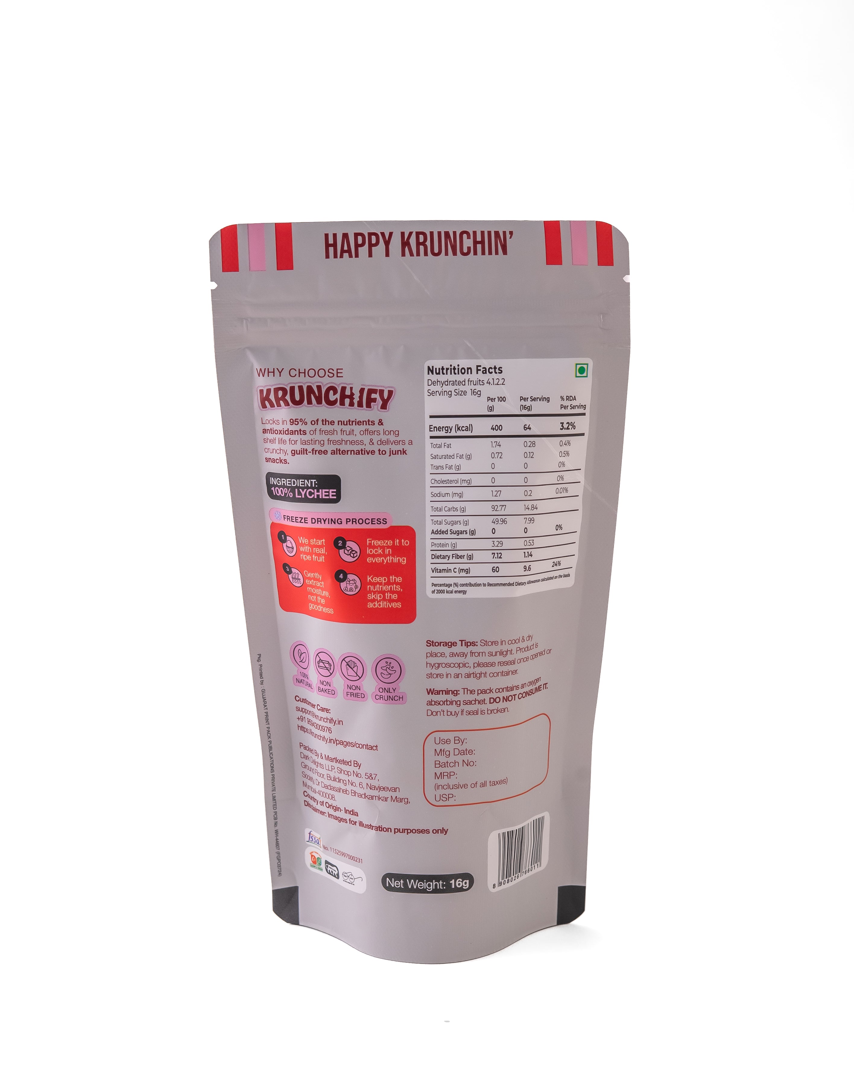 Savor the exotic sweetness of Lychee in a crisp, bite-sized form! Krunchify Freeze-Dried Lychee keeps the fruit’s natural flavor, aroma, and nutrients intact, offering you a refreshing, guilt-free snack you can enjoy anytime, anywhere.